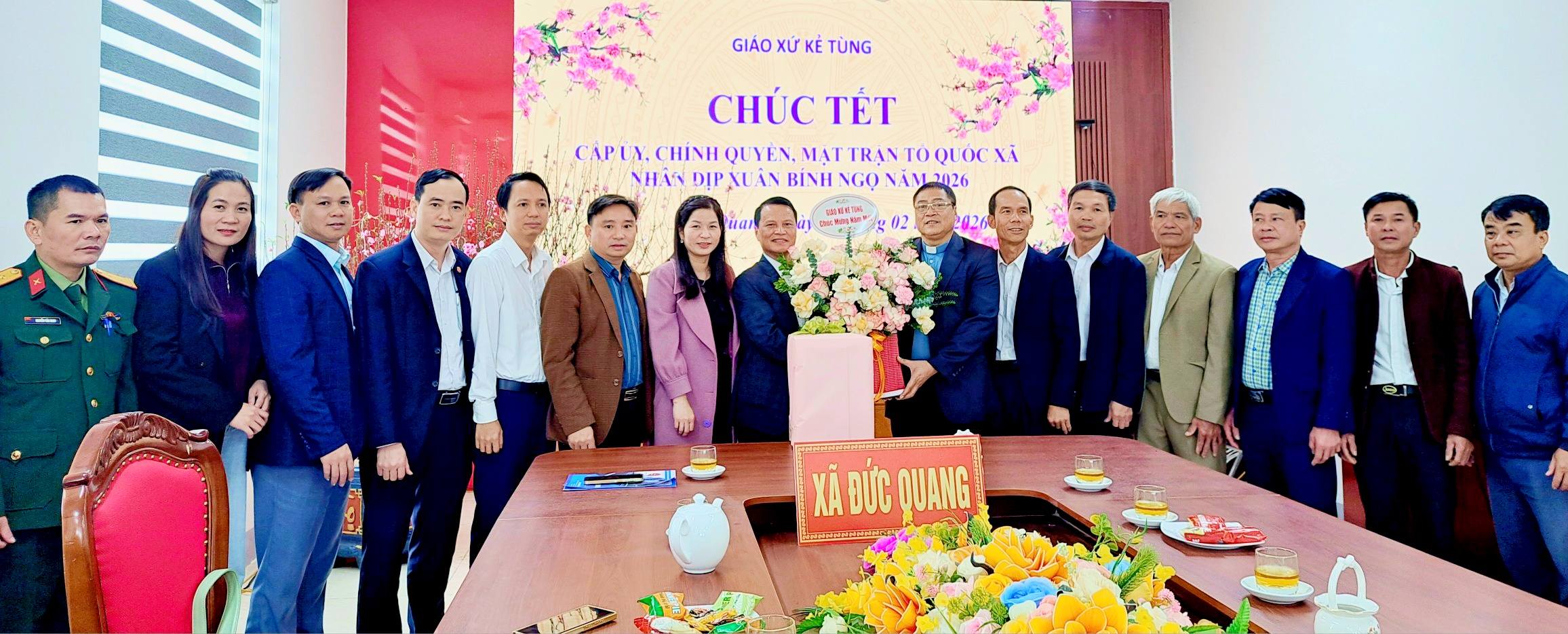 Các đồng chí lãnh đạo nhận quà và hoa chúc mừng năm mới của đoàn giáo xứ Kẻ Tùng gửi tới Đảng ủy, chính quyền, MTTQ và nhân dân xã Đức Quang.