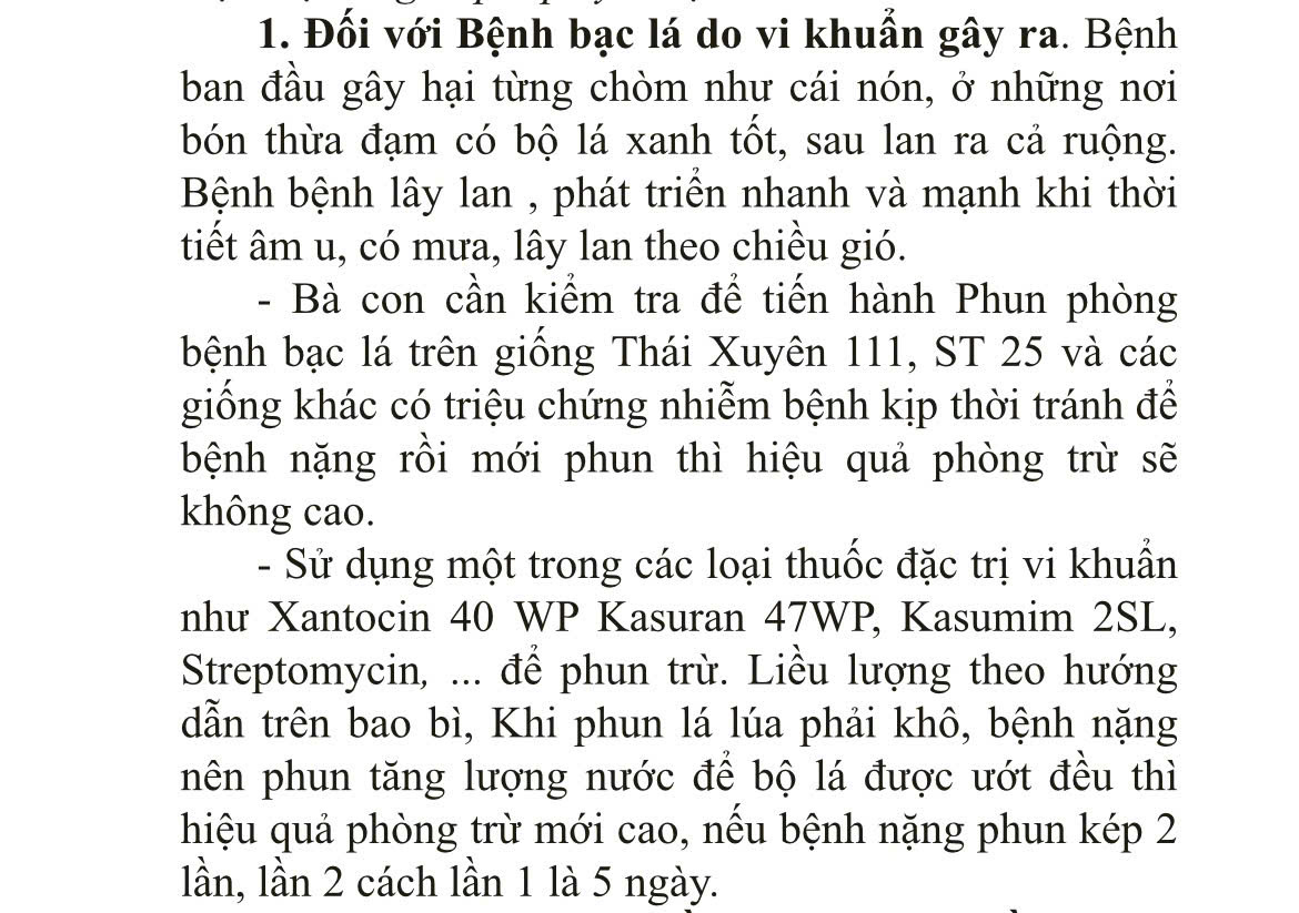 Đối với bệnh đốm sọc vi khuẩn: Bà con bón bổ sung 3-4kg kali hoặc 5-7kg NPK 15.15.15/sào, để tăng sức đề kháng cho cây lúa. Sau đó tiến hành phun một trong các loại thuốc như Xantocin 40WP hoặc Staner 20WP, để phòng trừ bệnh. Bà con có thể kết hợp với phun Tiltsuper 300EC để phòng bệnh khô vằn.