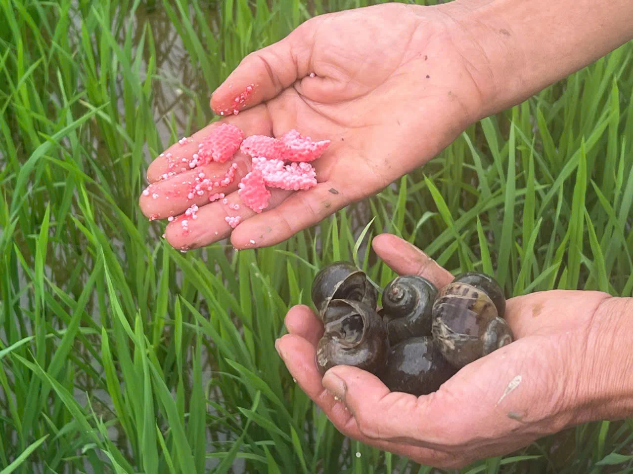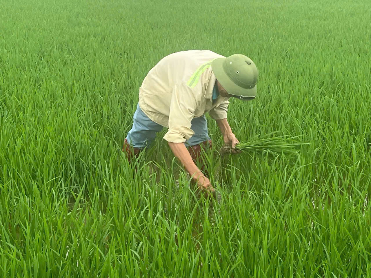 Từ sáng sớm, anh Lê Văn Đoài đã ra đồng tỉa dặm cho hơn 1 mẫu lúa vụ Xuân. Thời tiết sau tết mưa rào xảy ra thường xuyên, độ ẩm cao, nên nguy cơ phát sinh các loại sâu bệnh gây hại. Thời điểm này, anh thường xuyên thăm đồng, vừa tỉa dặm, vừa diệt trừ ốc bươu vàng sinh sôi, nảy nở.