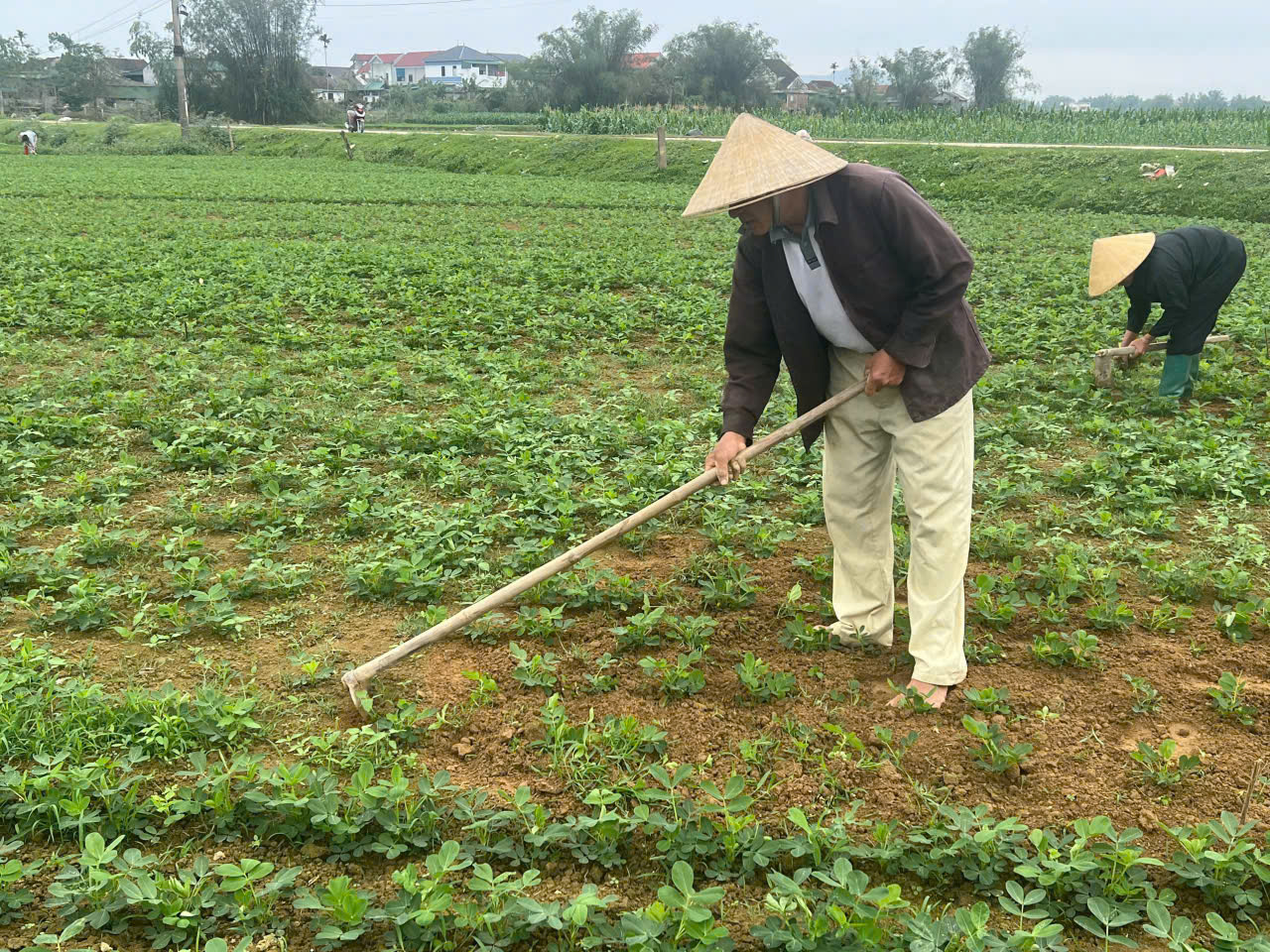 Không chỉ lúa, các diện tích cây trồng cạn cũng được chăm sóc bài bản. gia đình ông Bùi Đình Hoàng cũng đang tập trung làm cỏ, vùn gốc cho 2 sào lạc mới lên xanh mướt. Mặc dù tuổi đã cao, nhưng vụ xuân hàng năm gia đình đều duy trì sản xuất 2 sào lạc, vì đây là một trong những loại cây trồng đưa lại nguồn thu nhập đáng kể. Nhờ cơ cấu giống lạc cao sản L14, cùng với việc làm đất đúng quy trình kỹ thuật, dày công chăm sóc mà vụ xuân 2025 năng suất đạt 3 tạ lạc khô/sào. Giá bán mỗi tạ 4 triệu đồng. Sau 4 tháng gieo trỉa, gia đình ông thu về 24 triệu đồng.
