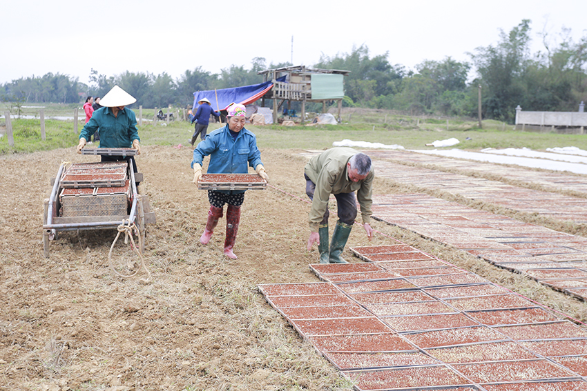 Xã viên HTX nông nghiệp hữu cơ Thần nông bắc mạ khay để phục vụ sử dụng máy cấy.