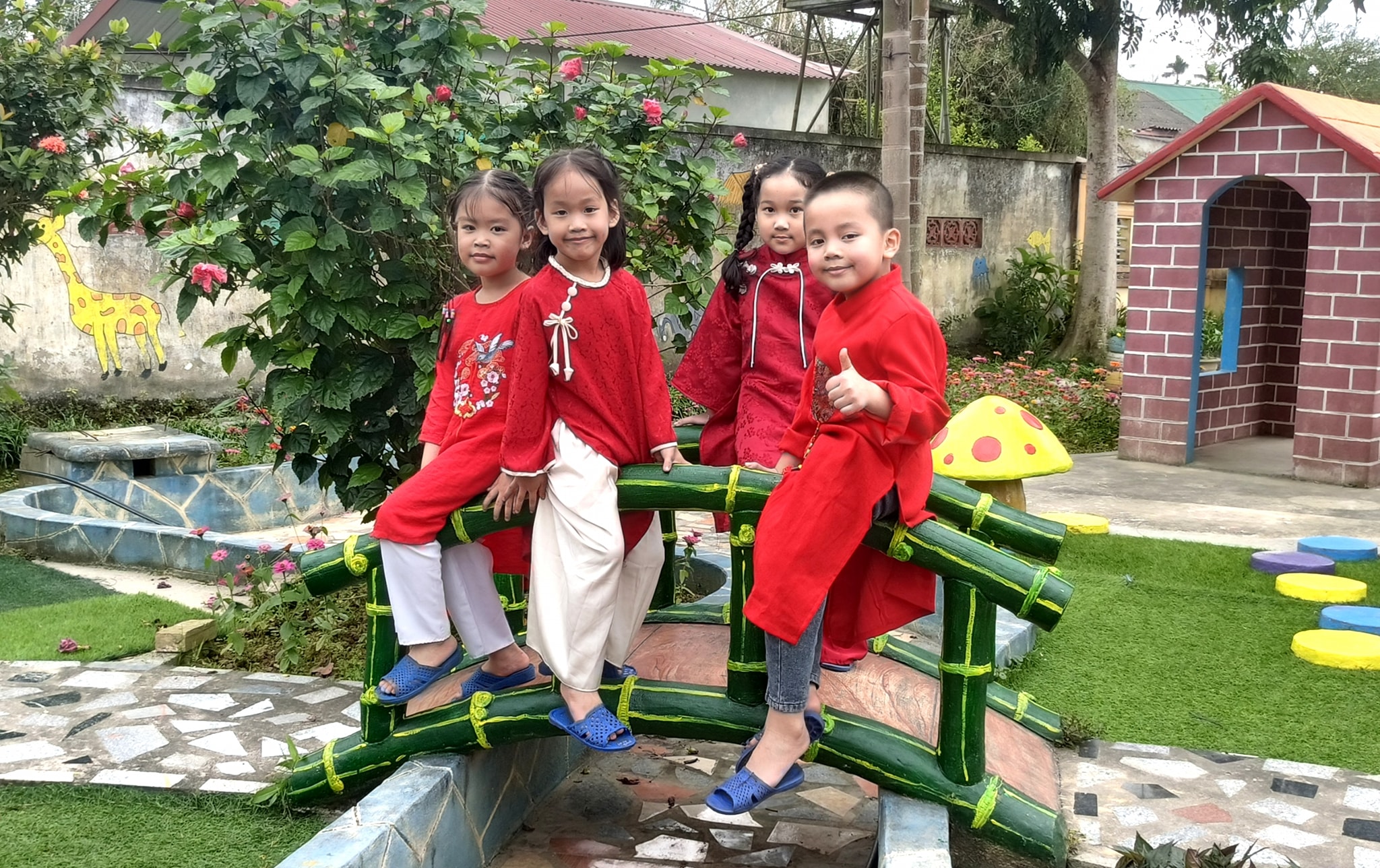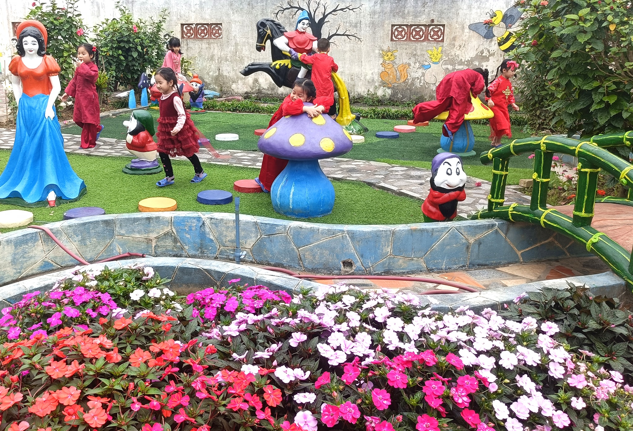 Vườn cổ tích” được xây dựng từ những vật liệu gần gũi, tái chế, kết hợp cùng bàn tay khéo léo và sự tâm huyết của đội ngũ giáo viên.