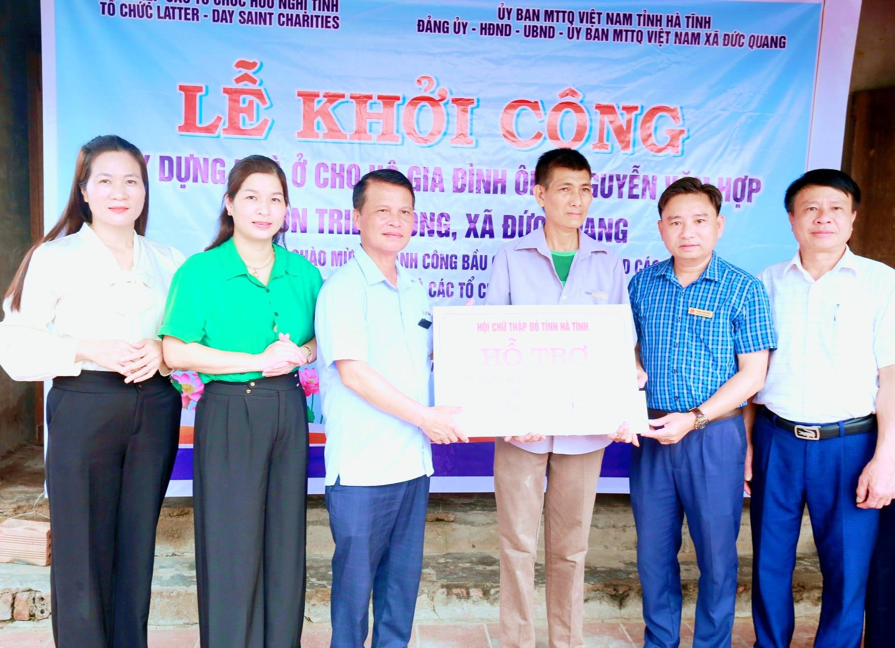 Các đồng chí lãnh đạo xã trao biểu trưng hỗ trợ 70 triệu đồng của Liên hiệp các Tổ chức hữu nghị tỉnh, Tổ chức Latter - Day Staint Charities, và Hội chữ thập đỏ tỉnh Hà Tĩnh hỗ trợ 3 triệu đồng.