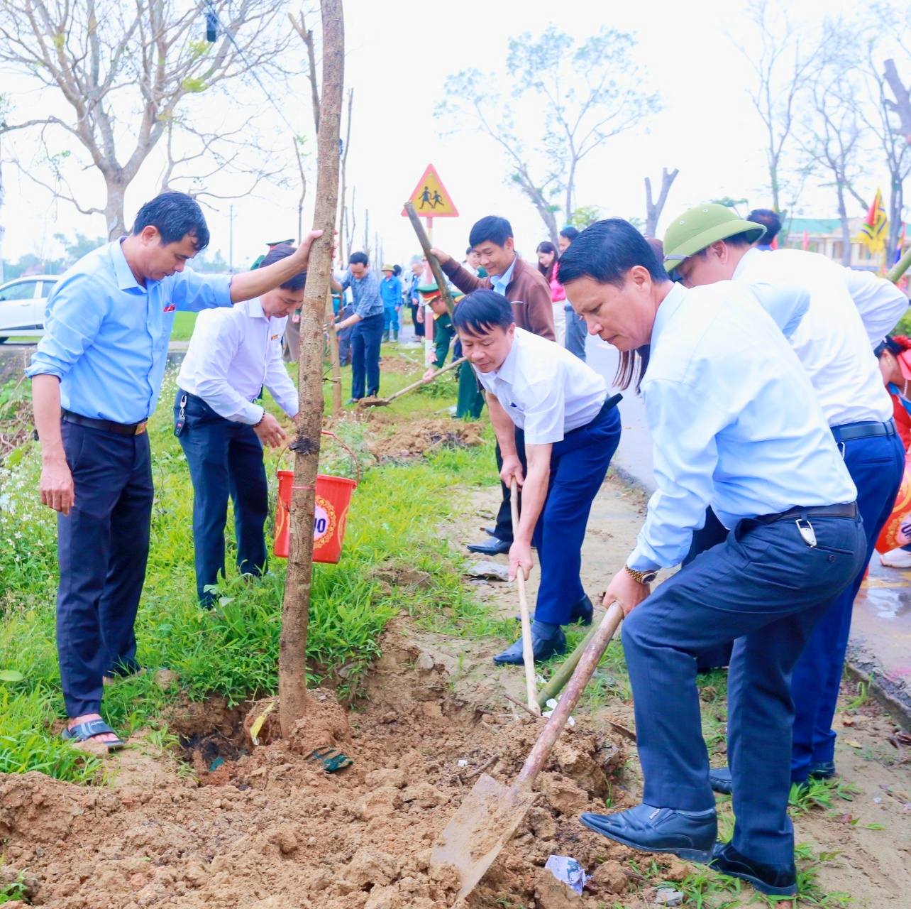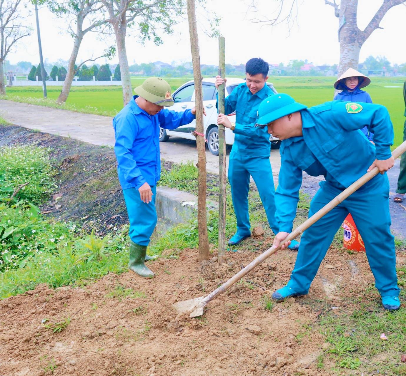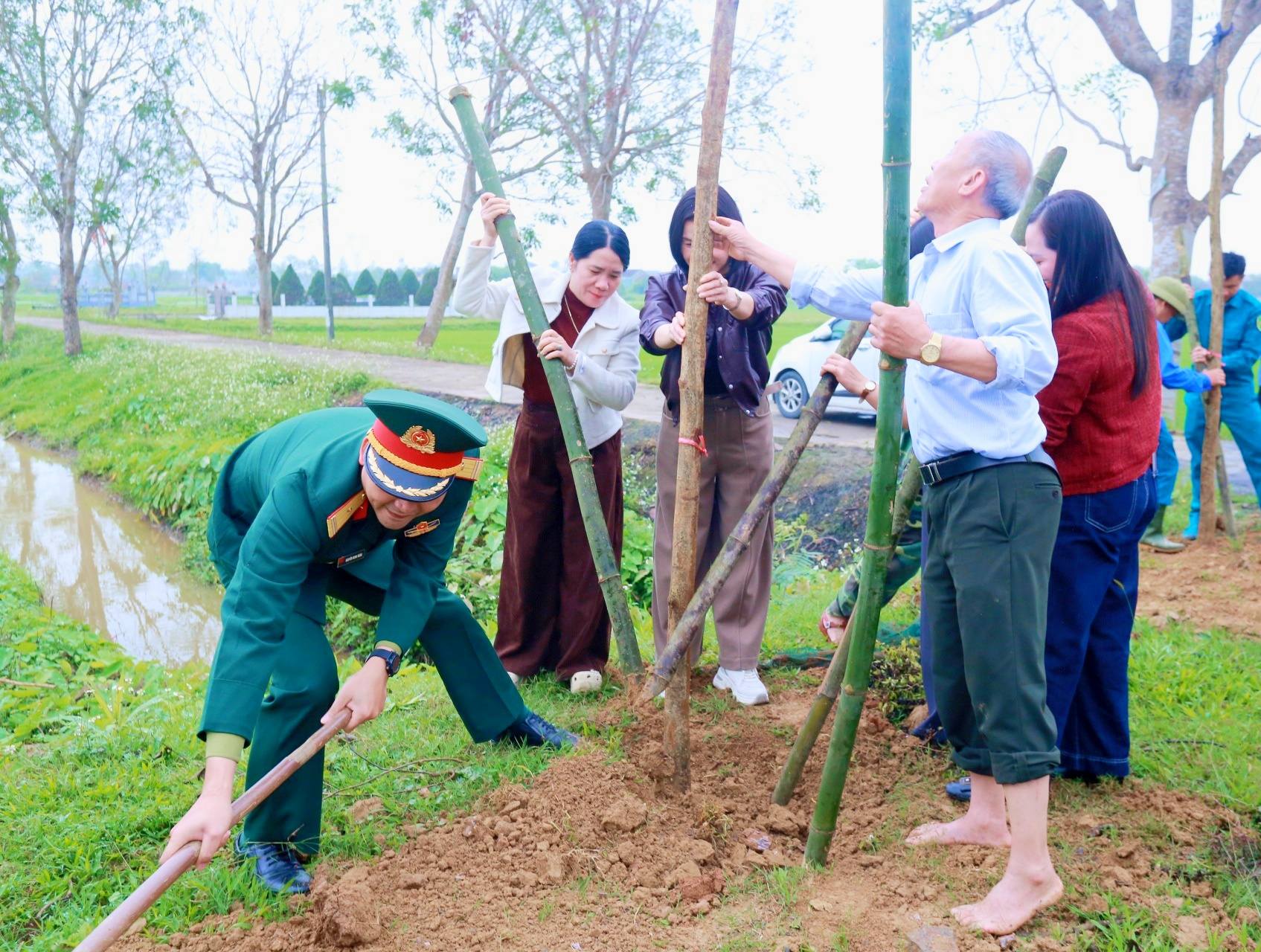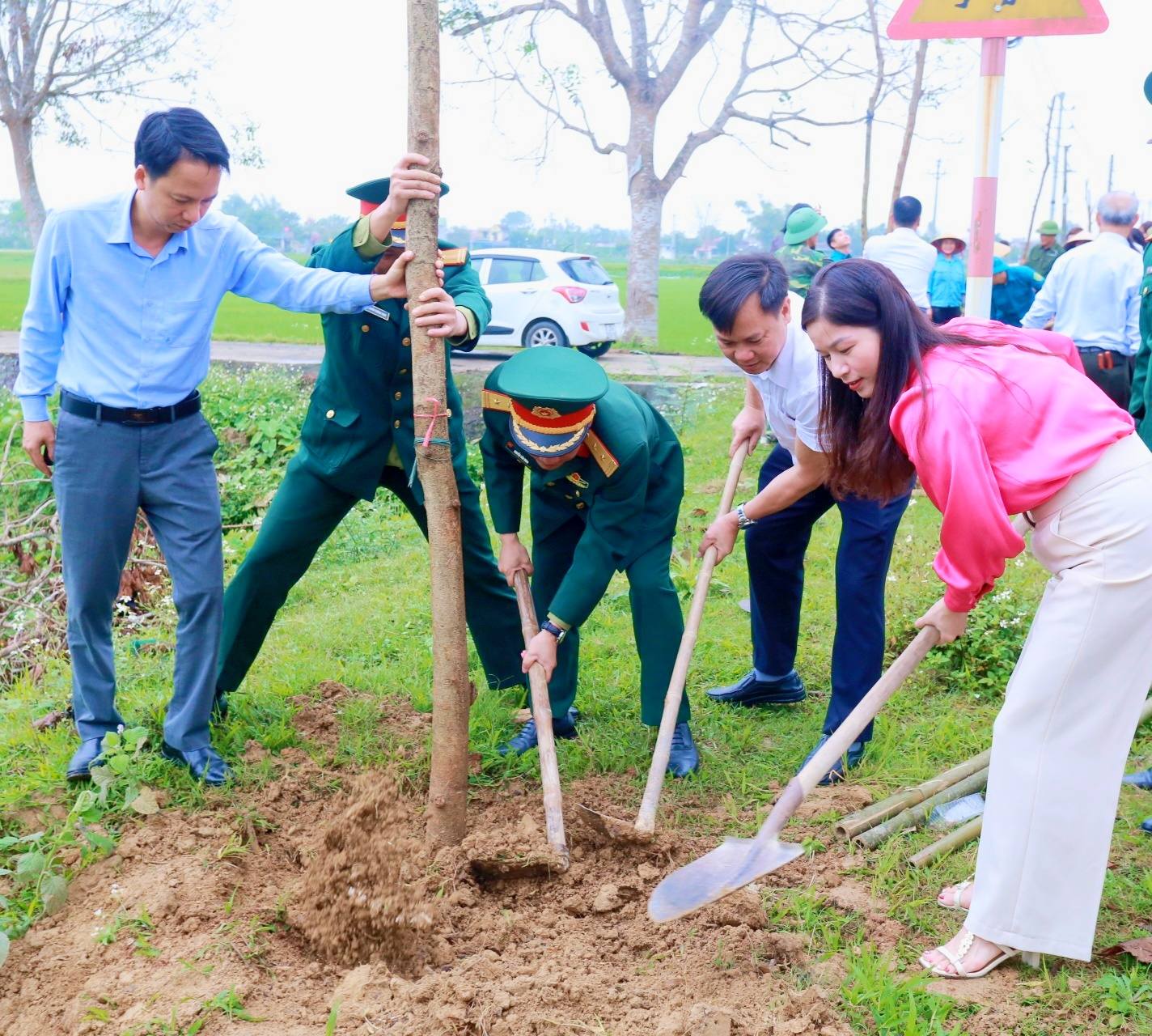 Các đồng chí lãnh đạo xã trực tiếp trồng cây tại điểm ra quân ở thôn Trung Hậu
